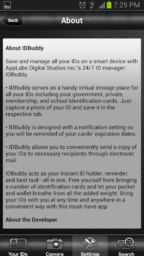 Ever found yourself in a situation where you needed to show proof of identity and you didn't have anything with you? Solve your identity mishaps once and for all with AppLabs Digital Studios' first identification card management tool—IDBuddy.