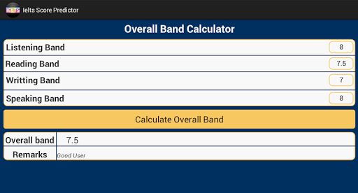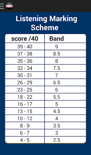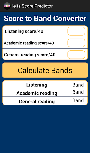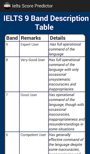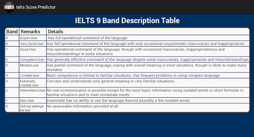 This app lets you to convert your score(out of 40) to your band score.It also helps you to calculate your overall band. It also contains marking scheme tables for listening,academic reading and general reading tests as well as IELTS 9 band description table which includes remarks for respective band and details of your band score.