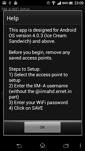 The app will automatically setup the access point for IIM-A WiFi network when the username and password is provided.