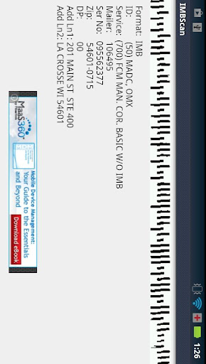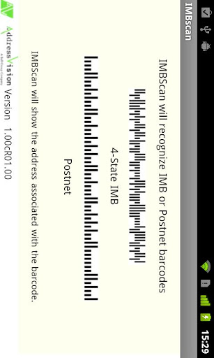 After launching the app and pressing the Start button, simply aim your phone's camera at the barcode, align the red line over the barcode and hold still for a couple of seconds. As soon as IMB scan obtains a positive read from the barcode it will automatically display all the elements read.
