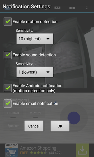 Notification Settings dialog allows you to turn the email notification on and off, assuming that your email accounts have already been specified in IP camera's administrative setup. The “Enable Android notification” (MJPEG cameras only) option allows a background service to be activated or deactivated on your Android device. The notification will be created and will appear in the status bar with the alert sound when your IP camera, i.e. the one selected in the main screen, detects movements even when the app is not running. The sensitivity value can be selected from the Sensitivity drop-down list, e.g. the "Highest" sensitivity makes IP camera become very sensitive in detecting any movements, which will will cause an email to be sent to your email account.