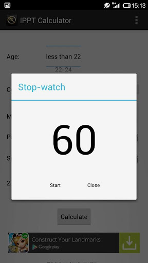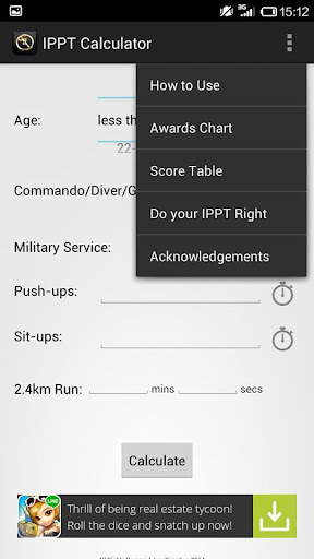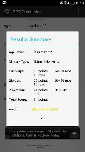 This app allows the user to calculate ippt score and award based on push-up, sit-up repetitions and 2.4km run timing. Added 60 seconds countdown timer to help user train for push-up and sit-up at convenience.