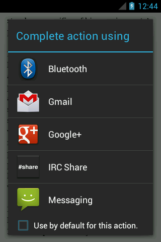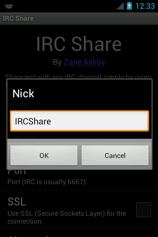 A tiny and simple utility for sharing text with any IRC channel simply by using the Android Share menu! Works great with the "Imgur Android" and "CatLog" apps!