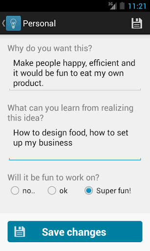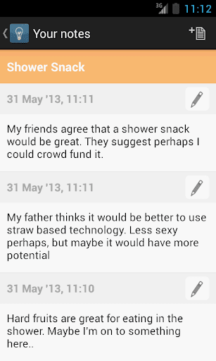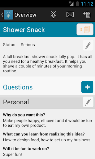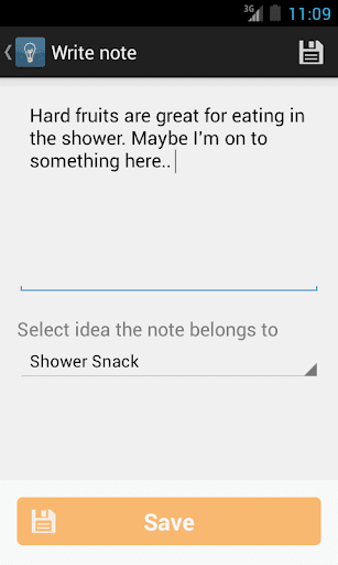 When an idea pops up, quickly write it down and get back to sleep or your meeting (or both). Add notes and improve on your ideas by answering questions about personal motivation, the business side and much more.