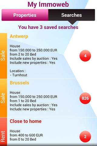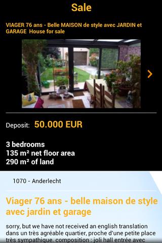Use our search engine to find the property you're looking for in only a few clicks away. You can also save your preferences to receive notifications whenever new properties matching your criteria's are published or receive price updates for saved properties. With Immoweb on Android, real estate is in your pocket.