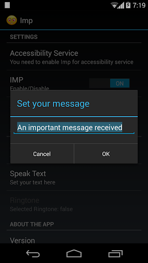 1) To Enable this app Open -> Select Accessibility Service->Select Imp Application -> Select Top Right Corner to On -> Press OK.