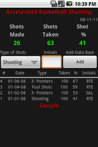 Of course, for any workout or practice to be effective you need to keep track. With Accelerated Basketball Shooting(Pro Edition), hit the menu button and BAM. A quick easy data base help players and coaches keep track of how they are doing. Instantly logs shots taken, percentage,and date. Enter initials and type of workout to complete the log.