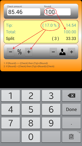 1) if the Round value you enter is smaller than the Bill amount is considered as a TIP, some times you just prefer to add specific tip, you will see the tip percentage, total to pay and the split amount immediately.