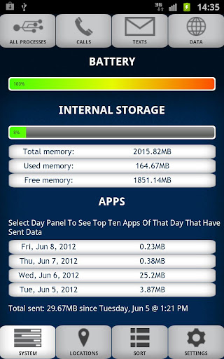 InSight gives you a way to know if spyware, malware, or unintended apps on your Android smart phone are sending out your data without your knowledge. InSight provides the ability to see the amount of data each app is sending out, what processes are running in the background, what text messages are being sent, and displays what phone calls have been made from the smart phone. InSight also allows you to easily force close any app, process, or service that may be acting suspiciously. Additionally, InSight shows you the top ten apps that have sent out data up to that point in time. None of your data gets sent out with this app - but it lets you know if other apps, malware or spyware are sending your data out!