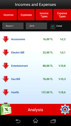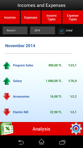 Summary and details for income and expenses. Filtering by month and year in the main screen.