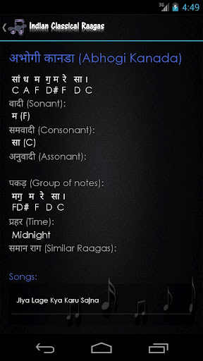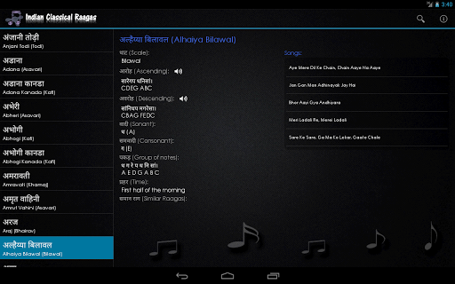 "Raga" is a melodic mode used in Indian classical music. It is a rhythmic expression of a mood in Indian melody. "Indian Classical Ragas" is an e-Learning application where you can learn the Ragas by knowing Aaroh, Avaroh, Vaadi, Samvaadi, Prahar and some more information. Application also displays the list of famous hindi songs based on the ragas for reference.