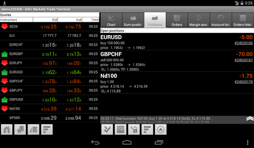 Infin Markets Trade Terminal is highly functional and convenient for every trader. The mobile platform enables all the basic functions of a full scale stationary platform, such as: