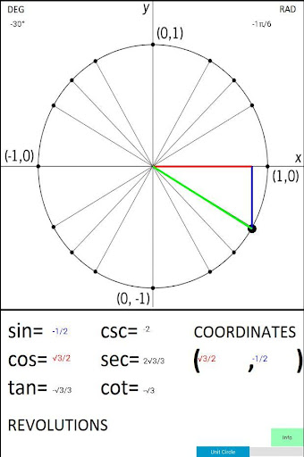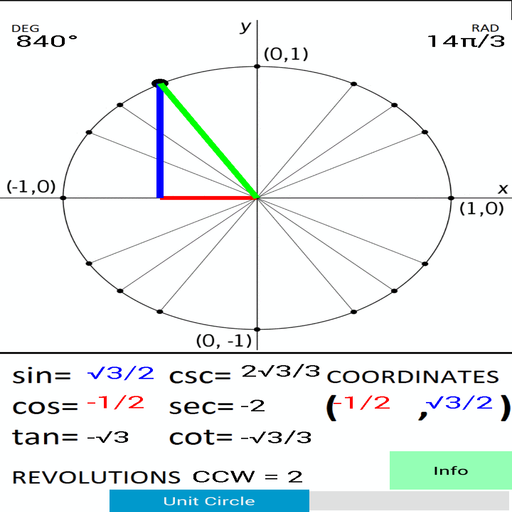 The unit circle along with trigonometric functions is a common topic for high school geometry and beyond. This app can help students to understand coterminal angles and trig functions. You are not limited to 360 degrees like most other apps.
