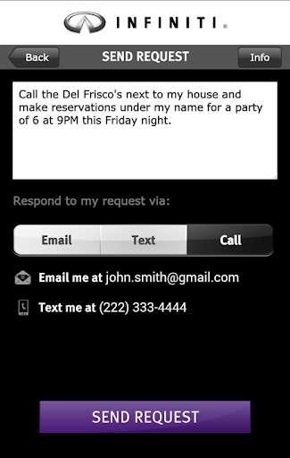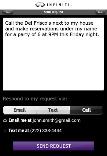 The Infiniti Personal Assistant app provides registered users of the Infiniti Personal Assistant service with expanded access to a world-class team of professional assistants. The mobile app gives registered users the ability to make requests from anywhere in the world with a cellular or data connection. Added functionality also enables users to optionally submit their geolocation when calling or submitting a request. Now your team of Infiniti Personal Assistants will be able to use your location to better assist you. Users will also have instant access to their local Infiniti retailer's contact info, their vehicle's VIN, and other Infiniti information. Let Infiniti continue to inspire you at every turn - download the free Infiniti Personal Assistant app today. If you have any suggestions, questions, or need some help, send us an email to support@infinitipersonalassistantapp.com - we are happy to help!