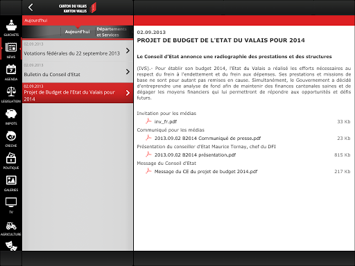 Cette App délivre en continu la communication de l'Etat du Valais. Elle offre des informations de première main sur la politique cantonale, les communiqués, les news et l'agenda, ainsi que sur les thèmes suivants: élections, votations, actualités, manifestations, services publics (prestations et localisation), transports valaisans, etc.