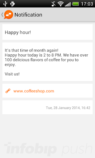 Infobip Push Android demo application is used for testing the Infobip Push service. We created an easy to use mobile application which can be downloaded and installed on any Android mobile device starting from OS version 2.2. Testable features are: channels, media push, geo targeting, live geo and SMS fallback.