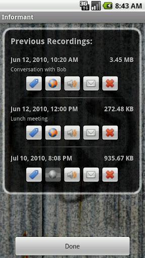Wearing a wire was never so easy! Informant turns your Android phone into a covert eavesdropping device — it can start recording any audio it hears immediately, or can be scheduled to start recording in advance (never get busted “playing with your phone” in a meeting to start recording). You can even choose to have absolutely no visible indication on the phone while it is recording for the ultimate in discretion!