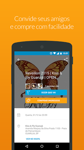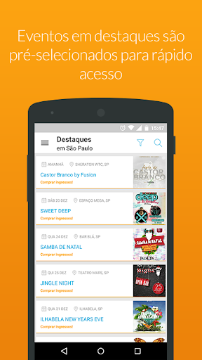 Comprar ingressos pelo aplicativo é tão fácil quanto no site. Os eventos estão divididos por região e estilo como festas e baladas, festas universitárias, teatro e cultura e, shows e festivais. Ao escolher seu evento e a forma de pagamento, seu ingresso ficará armazenado na carteira de ingressos.