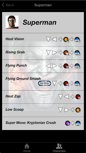This app gives you access to all special attacks and super moves of all characters from "Injustice: Gods Among Us".