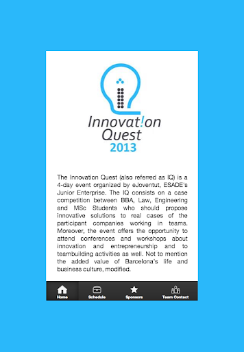 The Innovation Quest (also referred as IQ) is a 4-day event organized by eJoventut, ESADE's Junior Enterprise. The IQ consists on a case competition between BBA, Law, Engineering and MSc Students who should propose innovative solutions to real cases of the participant companies working in teams.