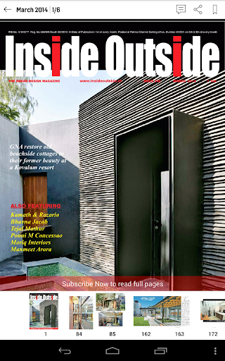 INSIDE OUTSIDE - India's most respected and highest circulated interior design magazine. It is the first choice of the crème de la crème of professional designers and architects. With its incisive coverage and wide range of profiles, Inside Outside is an important forum for both the professional as well as the lay reader. Over the years, the magazine has grown to be the bible for the community of Indian architects and the professional interior designer. It is revered for its authority and selection of coverage. Professionals consider it an honour to be published in the pages of this premier interior design magazine. The magazine focuses on well designed interiors. Be it residential or commercial, INSIDE OUTSIDE covers the exclusive and luxurious, to the low cost and space conscious. Designing on small budgets and problem solving is a special area of editorial interest, and even the lavish apartments featured are replete with ideas that can be emulated in more modest homes.