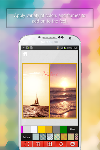 Choose from many frame styles, add photo effects and share them using Instagram, Facebook, Twitter, save into the picture gallery and more.