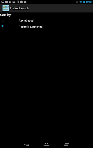Instant Launch is an app launcher, which allows you to launch apps from a single list. It includes a search feature which you can use to quickly find a specific app. The list of apps can be sorted either alphabetically or by last used. These settings can be found in Settings under the action bar menu.
