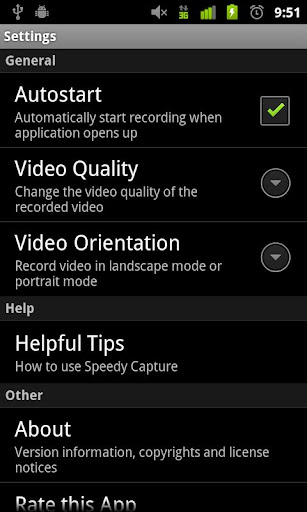 Have you ever needed to record a video and having to fumble the phone while switching from Photo to Video? Speedy Capture solves your problem by making it simpler to record. Just open the app to record, and exit the app to stop recording. You can change the setting to turn off automatic recording in Settings.