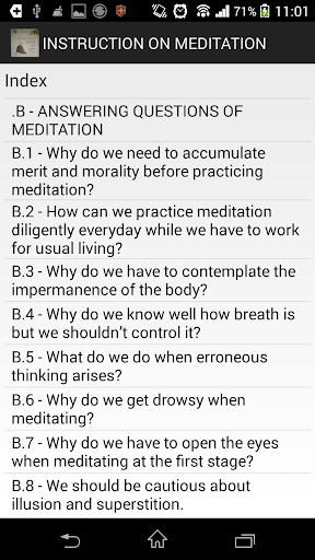 Meditation is a practice of concentration of mind. It is to lead mind to peace and insight, and to keep mind away from thought and sentiment. Specially, meditation can help practitioners destroy self and ignorance, and then attain Enlightenment.