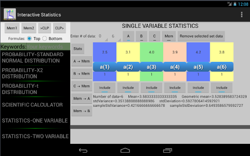"Interactive Statistics PRO" is ideal for students and graduates, you will find a variety of useful tools for statistics calculus and you can enter a value by touch, the interactive feature make it easy to avoid typing or human errors.