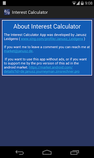 I can not guarantee that the computing of the interest runs without errors and calculates correct results. This app is intended to generate an estimate how much to expect before money is invested. I take no guarantee that these amounts are in fact reached at the end of the investment. If you are planing to invest large amounts please plan everything carefully with your financial advisor and not solely trust on this a small Android App.