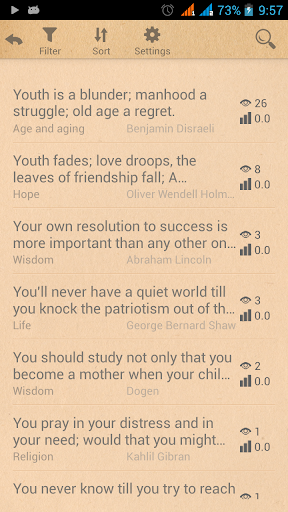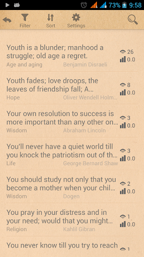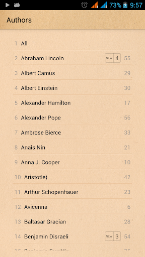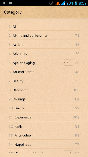 More than 2900 quotes, 100 authors and 50 categories (such as Humor, Love, Wisdom, Money and others).