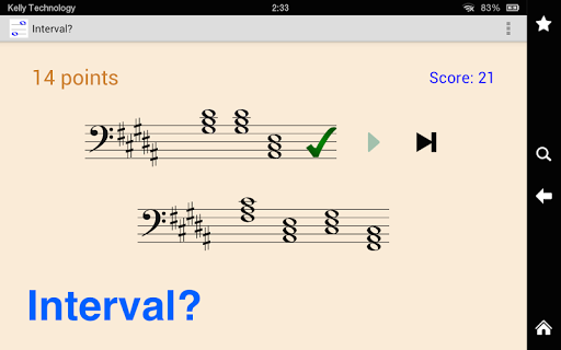 使用Interval通过对所弹奏的和弦进行判断来挑战您的音乐技巧。对于每一道题目都将弹奏三个和弦,其中前两个和弦会显示相应的音符。第三个和弦将会设置四个选择项-通过触碰正确的和弦选择您的答案即可。如果回答正确,每轮游戏所值的积分会添加至您的分数中,但是每个错误的答案将会扣减一半的积分。三个和弦的弹奏次数没有限制,同时您也可以跳至下一题目而无需作答并且没有惩罚。在反复聆听所弹奏的和弦的过程中,您的音乐知识也会得到相应的增长。您可以在钢琴和管风琴之间进行选择,作为游戏的弹奏乐器。