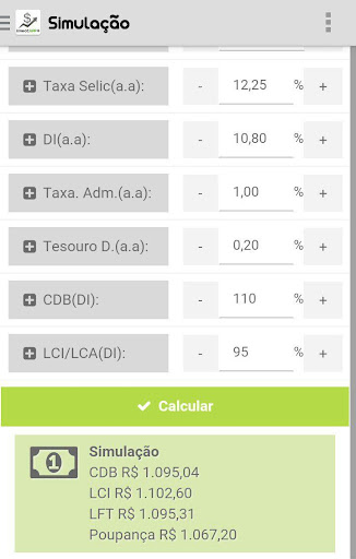 - Simulador conta com a rentabilidade nos seguintes investimento em Renda Fixa;
