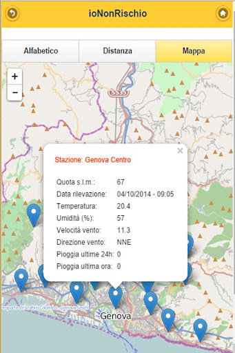 Inoltre l’applicazione offre la possibilità di navigare sulla mappatura delle aree potenzialmente allagabili pubblicate anche sul sito del Comune di Genova. Permette di visualizzare se l’utente si trova all’interno delle stesse o se un indirizzo da lui digitato corrisponde a quelli pubblicati on line e definiti come “Civici ricadenti nelle aree a rischio inondazione”.