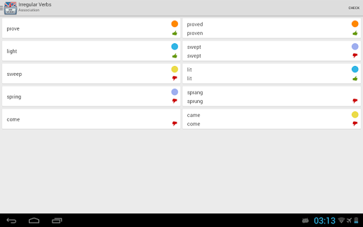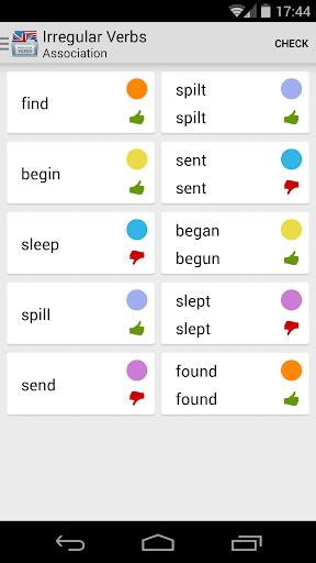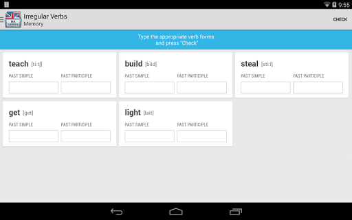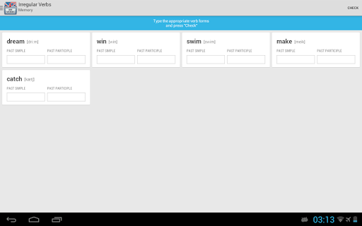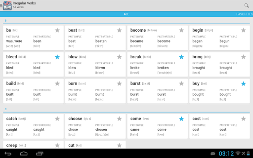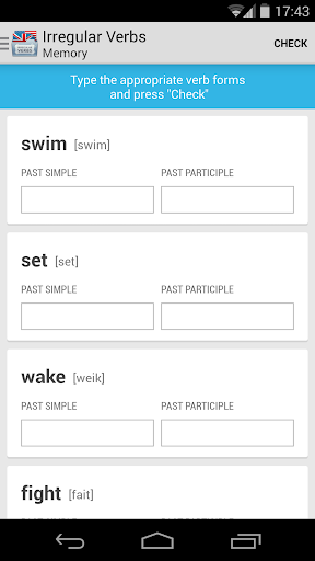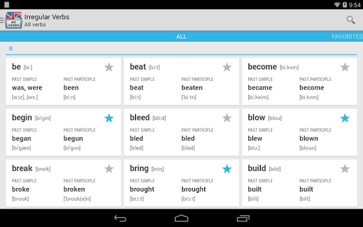 Your assistant for learning English irregular verbs. The application contains two types of exercises to learn the most popular irregular verbs. For each form of the verb has transcription.