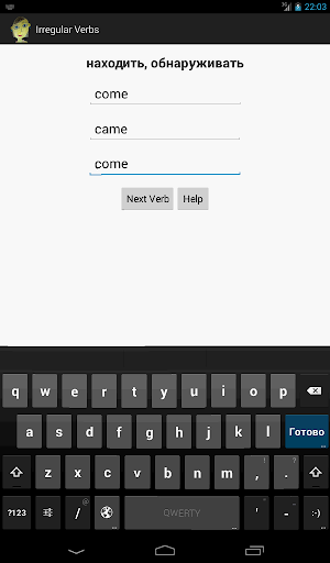 Вам предлагается наугад выбранный английский неправильный глагол в переводе на русский язык. Вы должны ввести в три поля все три формы этого глагола на английском языке. После нажатия кнопки "Next Verb", если не было допущено ошибок, задается следующий случайный глагол. Если вы не знаете написания глагола, нажмите кнопку "Help", чтобы получить подсказку. При этом слово помечается, как плохо знакомое, и будет вскорости повторно задано.