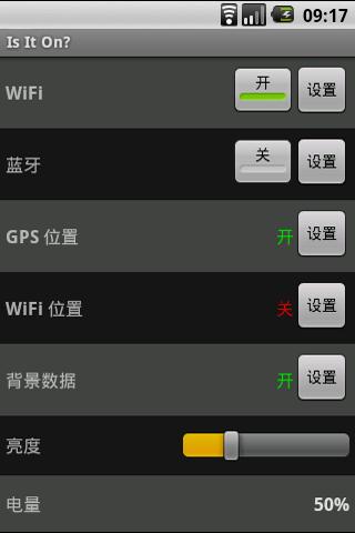 Simple, small, no frills user interface that displays on/off status of common settings, screen brightness and battery level.