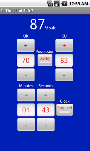 An implementation of Bill James' formula as published in Slate in March 2008 (www.slate.com/id/2185975). Just track the score, who has the ball, and how much time is left in the game, and the app will show you how safe the lead is. The perfect accompaniment for March basketball games!