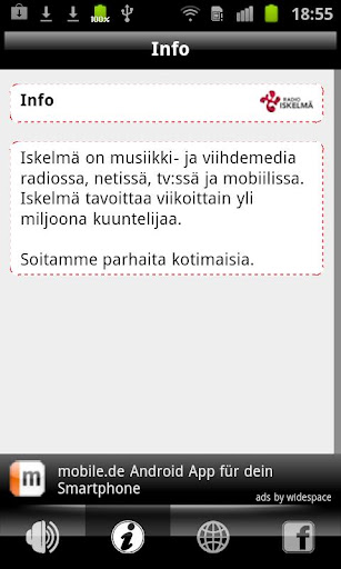 With this application you can listen to Iskelmä live stream on your Phone. The application also includes 5 other finnish radio stations: The Voice Radio, Radio 957, Radio Sata, Radio Jyväskylä and Radio Mega.