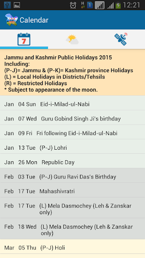 Provides Holidays list to be observed throughout the state of Jammu and Kashmir in 2015. Along it provides weather report in different regions of J&K as well as satellite image views of J&K from Indian Metrological Department.