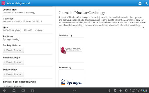 Tap into the most recent developments in nuclear cardiology with the Journal of Nuclear Cardiology app. The Journal of Nuclear Cardiology is a peer-reviewed medical journal published by Springer Science+Business Media. The Journal continuously publishes review articles, original papers and educational articles written by leading members of the medical community.