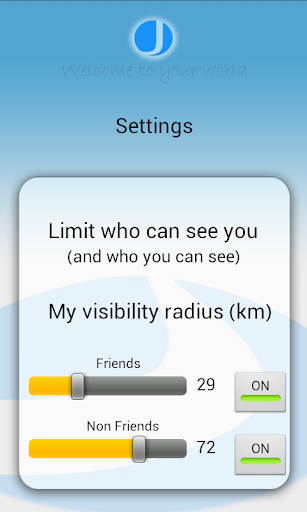 On J- map, markers indicate the real time positions of people. Green markers show you exactly where your friends are and blue markers show you where none friends are located. The next time you go out for the evening just check J-map to see where everyone is! (Be the first to get all your friends to download the app!) Click on a none friend who just happens to be near you in the real world and see instantly what friends you have in common and what interests you have in common too! Don’t be a stranger! Imagine seeing someone in a bar or a shop and before you even say hello for the first time you will know that they share a common passion or mutual acquaintance thanks to J-map! Great for breaking the ice! J-map is also an instant messenger. You can send messages directly to anyone on the map and receive messages back through the J-map server. The app integrates with Facebook making it completely compatible with your existing Facebook social network. The mutual likes feature is great for keeping you up to date with all the cool things your friends liked that you liked too! This feature also works for none friends so before you decide to say hello to a new person in the real world you know exactly how to break the ice! In time the map could of course become very busy and so the developers have included a proximity setting that allows you to set your visibility radius in kilometres. Set it to 50km and you will only be able to see people within that distance and vice versa.. If you decide you do not wish to be seen at all by friends or none friends – no problem! Simply set the radius of visibility to zero!