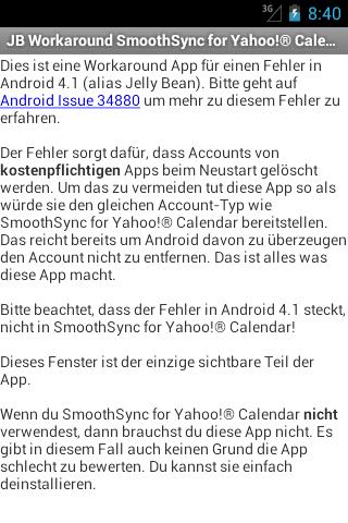The bug causes accounts of paid apps to be removed when Android boots up. To work around this issue this app pretends to provide the same account type that SmoothSync for Yahoo!® Calendar provides. That's enough to convince Jelly Bean to keep the account.