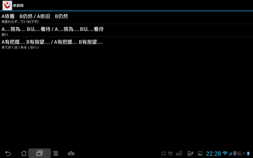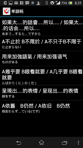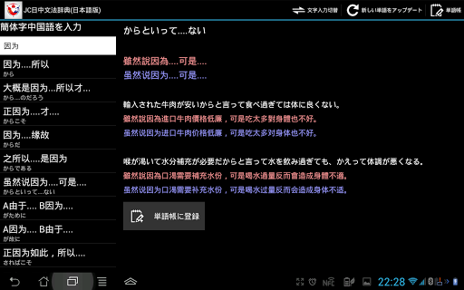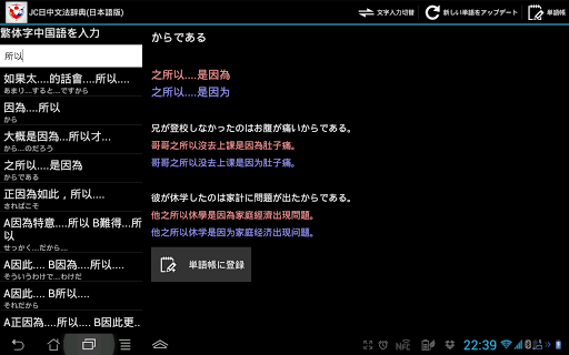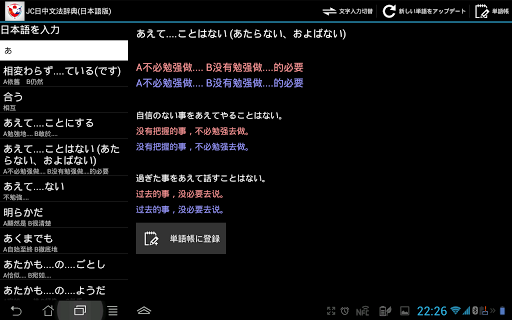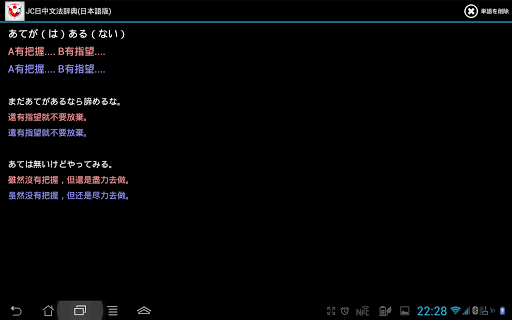 機能:日中、中日双方で検索可能、文型の意味と例文が表示されます。また単語帳に登録も可能で効率よく復習できます。