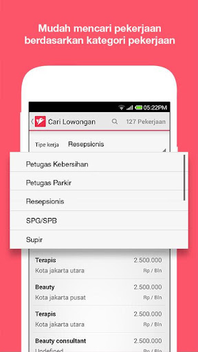• Pencari kerja dapat mencari pekerjaan berdasarkan posisi kerja, lokasi dan gaji yang mereka