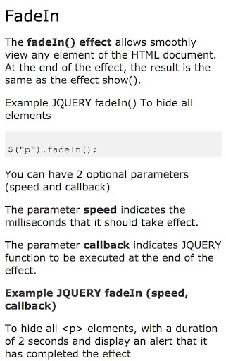 For the fade effect there are 4 possibilities: fadeIn, fadeOut, fadeToggle and fadeTo