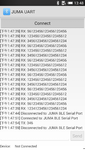 JUMA UART application can discover, connect and exchange data with other JUMA UART enabled devices within the Bluetooth RF range of the mobile device.