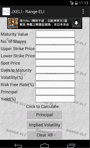 An application for calculating Equity-Linked Instrument. It covers Bull ELI, Bear ELI, and Range ELI. It can calculate the principal needed for the investment, the annualized yield, and implied volatility