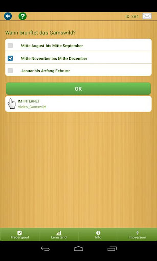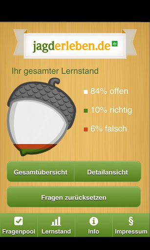 Bei jeder neuen Anwendung der App werden nur Fragen vorgelegt, die noch nicht oder falsch beantwortet wurden. Ist der gesamte Fragenpool richtig beantwortet, kann der Lernstand zurückgesetzt und neu begonnen werden. Der persönliche Arbeitsfortschritt kann im Lernstand insgesamt oder nach einzelnen Fächern beobachtet werden.